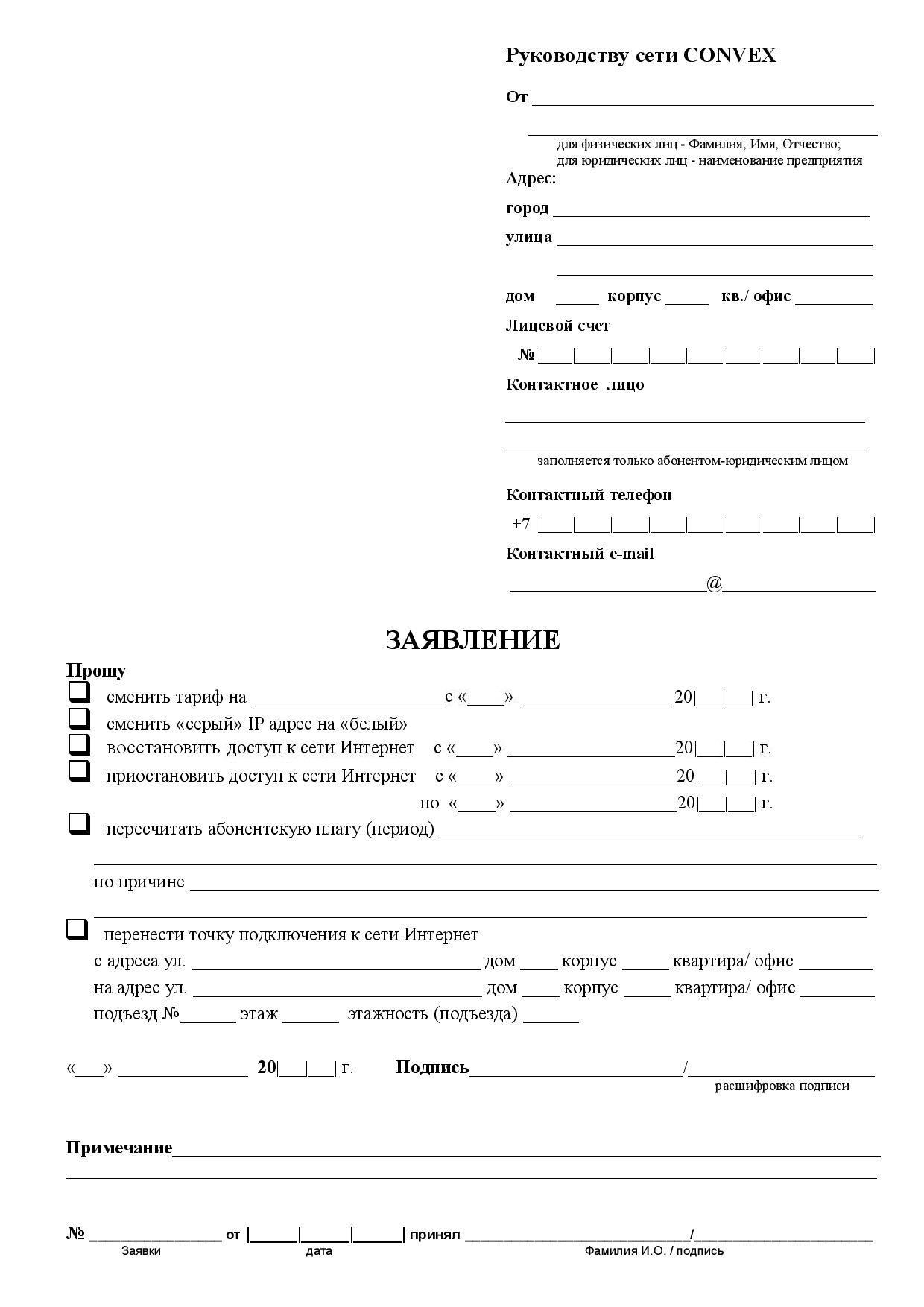 Универсальный бланк заявления для абонентов
